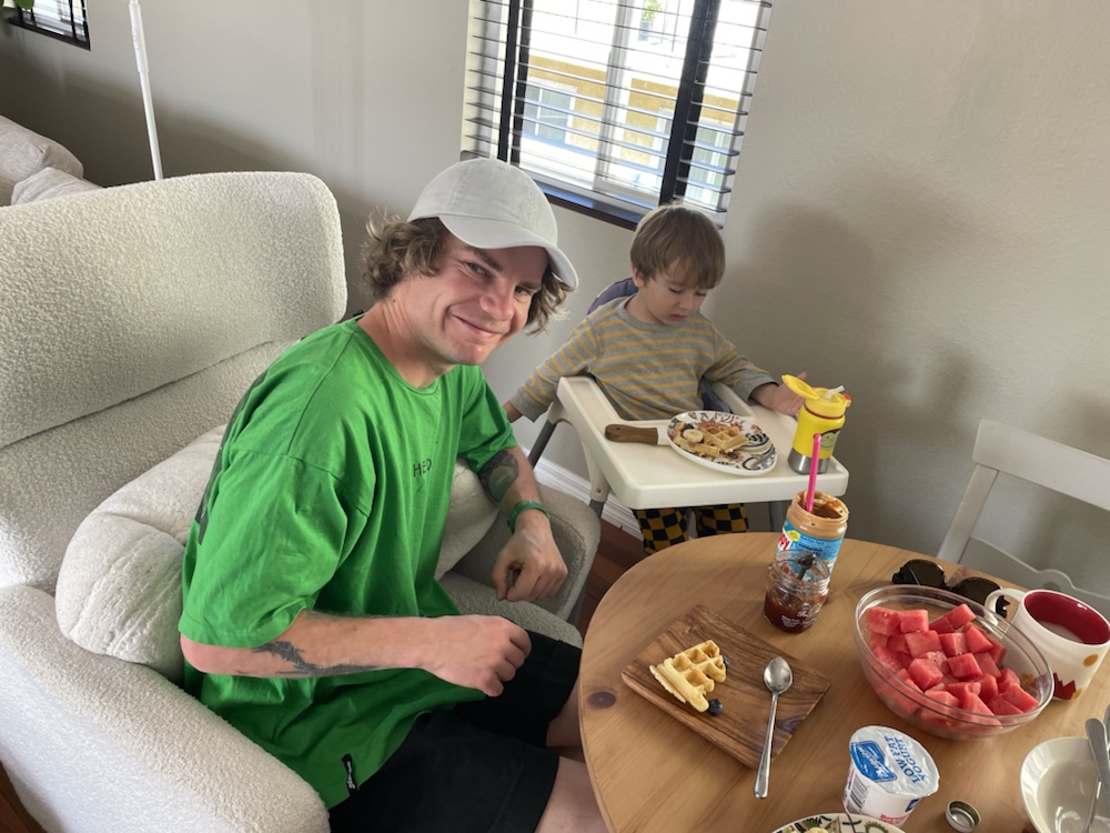 Wujek Szymon przywiózł nam polskie książki i mnóstwo słodyczy. Lubił tez robić Timotkowi fikołki i nosić Olinka na rękach. A wujek Tomo nauczył Timotka robić jajecznicę po skejtowemu.