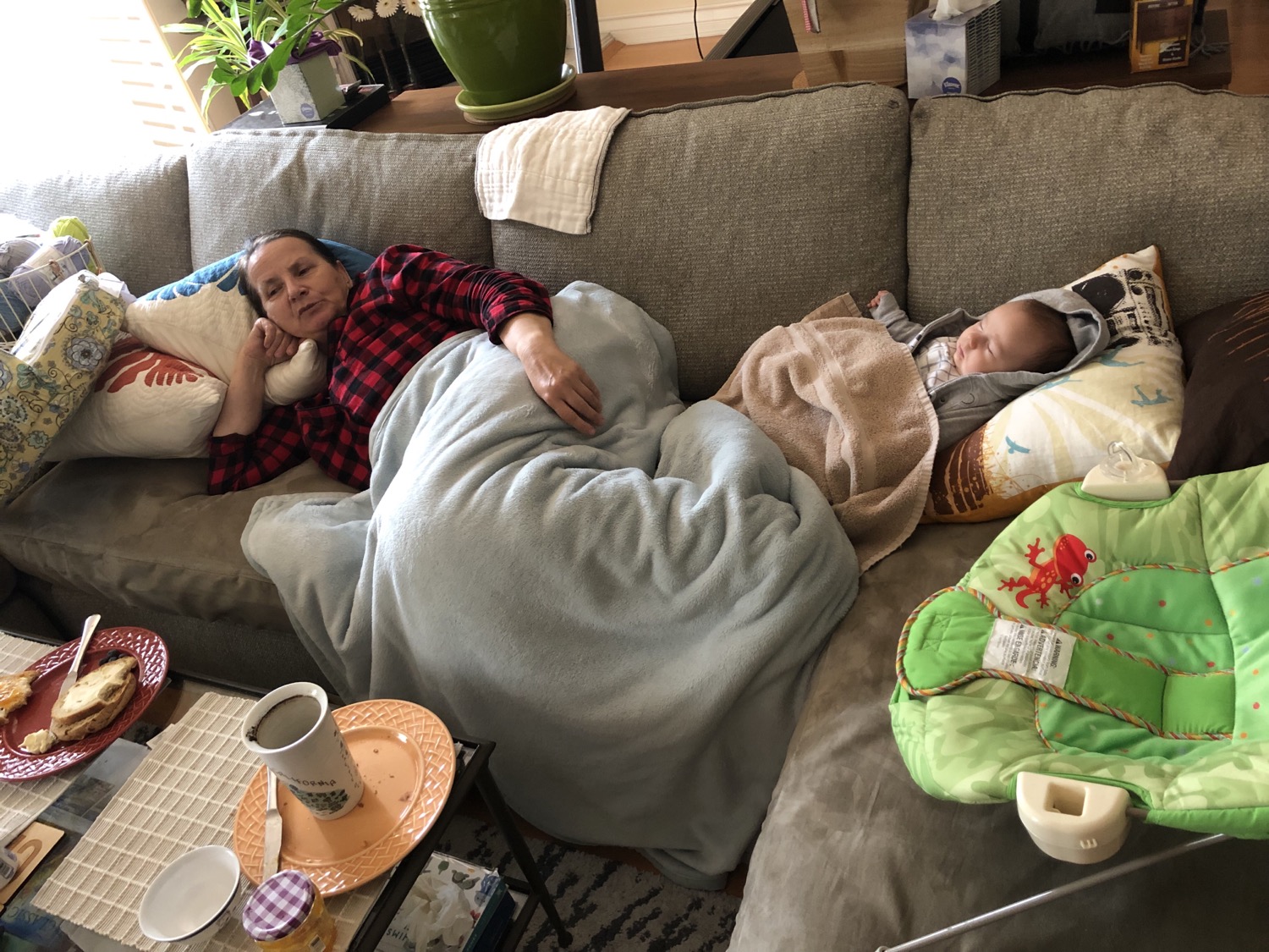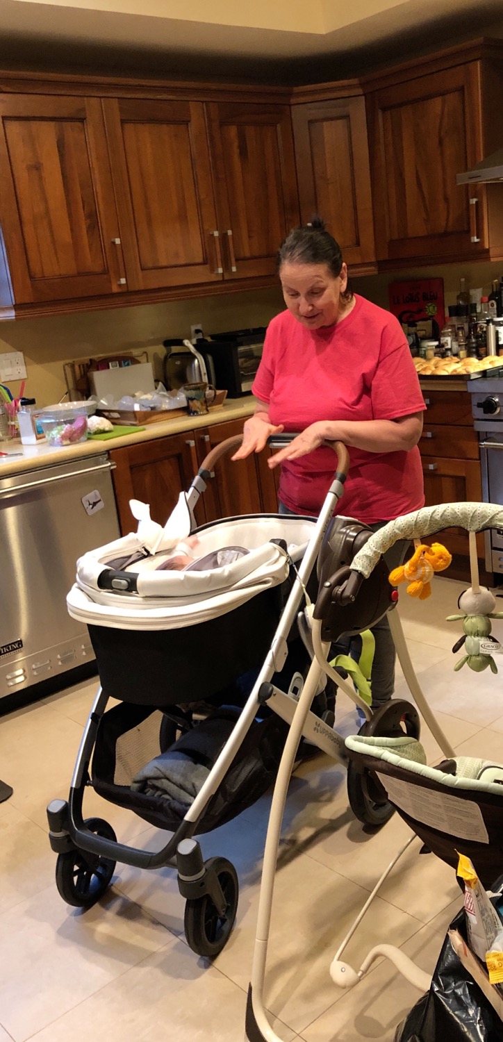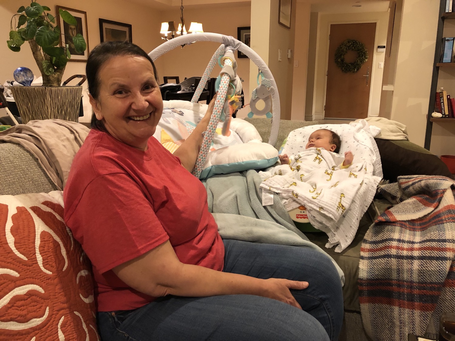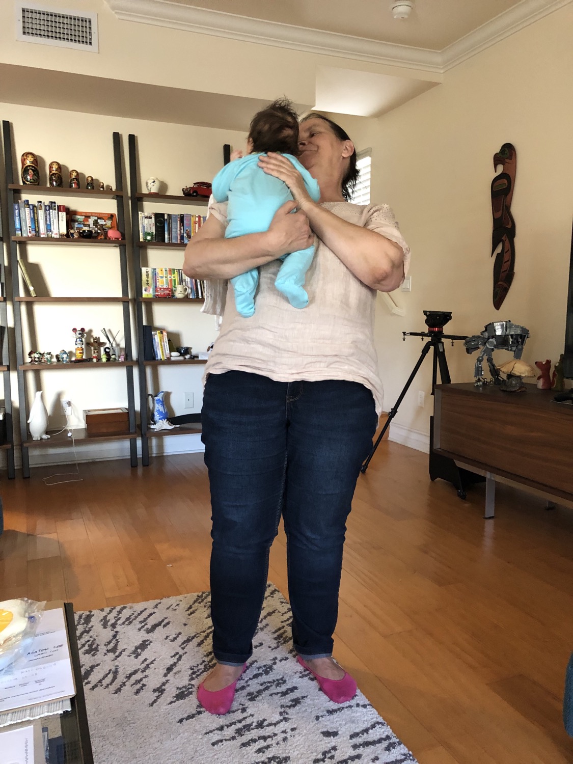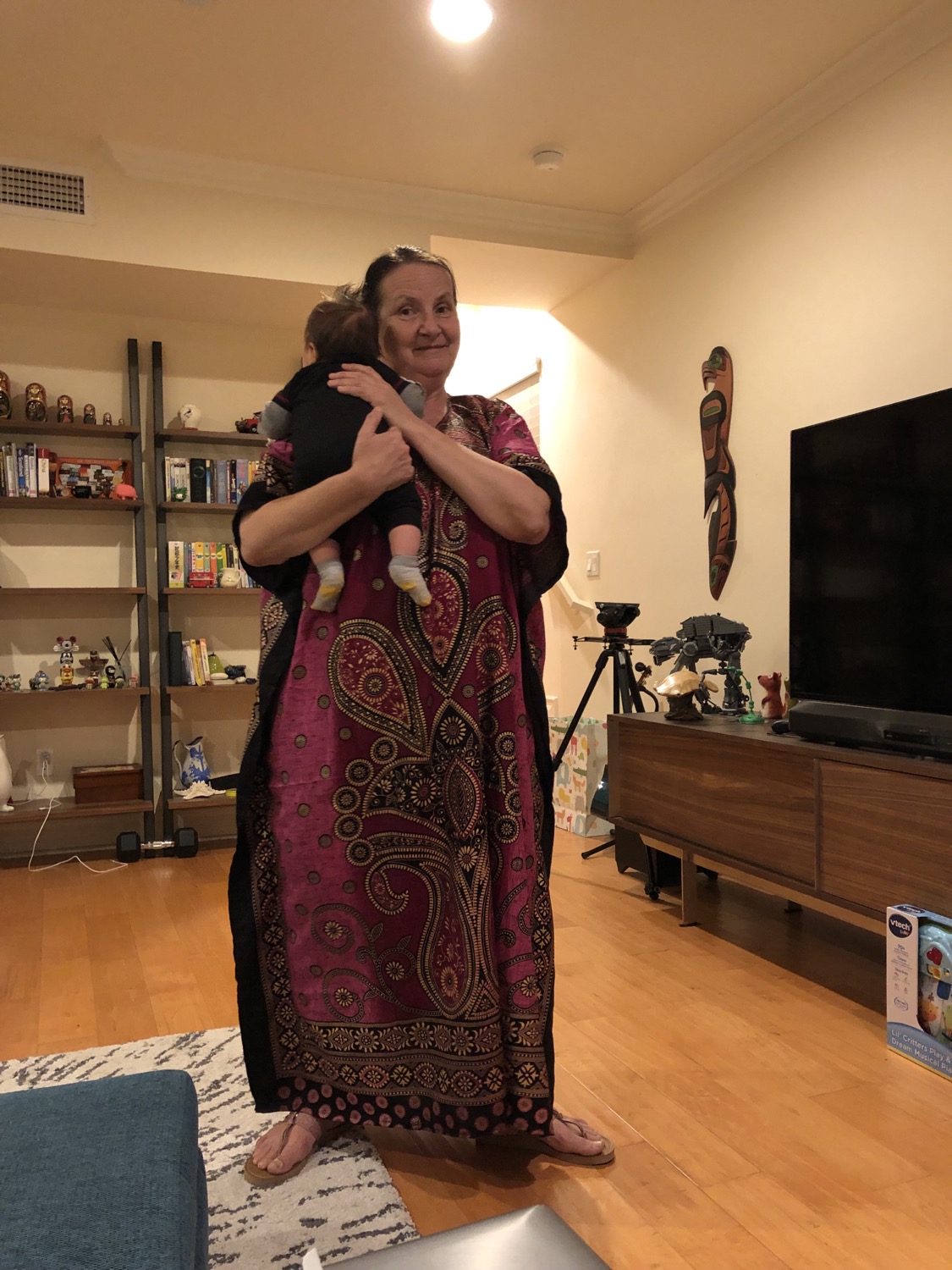 Tatuś musiał wrócić do pracy, a więc razem z babcią kontynuowaliśmy tradycje codziennych spacerów do (wybierz jeden): ChitChat, MatchaCha, Michael’s, Marshal, BedBath &Beyond, Japanese Market, Trader Joe’s, Lady Chocolate, CoCo Boba Tea, Poke Bowl, Ross Dress for Less. Babcia bardzo polubiła zmienianie pieluch i zawsze cieszyła się na porządny “urobek”. Wynajdowałyśmy coraz to nowsze zabawki, a wieczorami wracał tato i śpiewał/tańczył/pomarańczy z pieluchą tetrową w ręku dla Timusia, zazwyczaj przy akompaniamencie Childlish Gazebo ekhem Garbonzo.