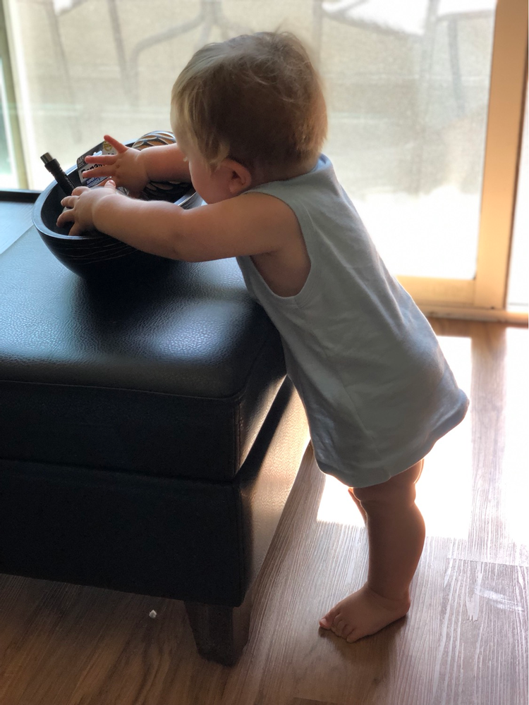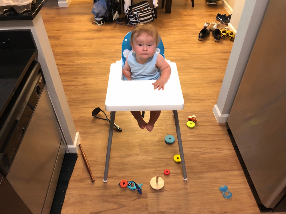 To był dobry dzień. Timmy uczył sie zjawiska zwanego grawitacjã oraz spędził sporo czasu przekładając groszek z jednej ręki do drugiej. Nie wspominajãc już o tym, że stał o własnych siłach przez dobrych parę chwil przy stoliku !