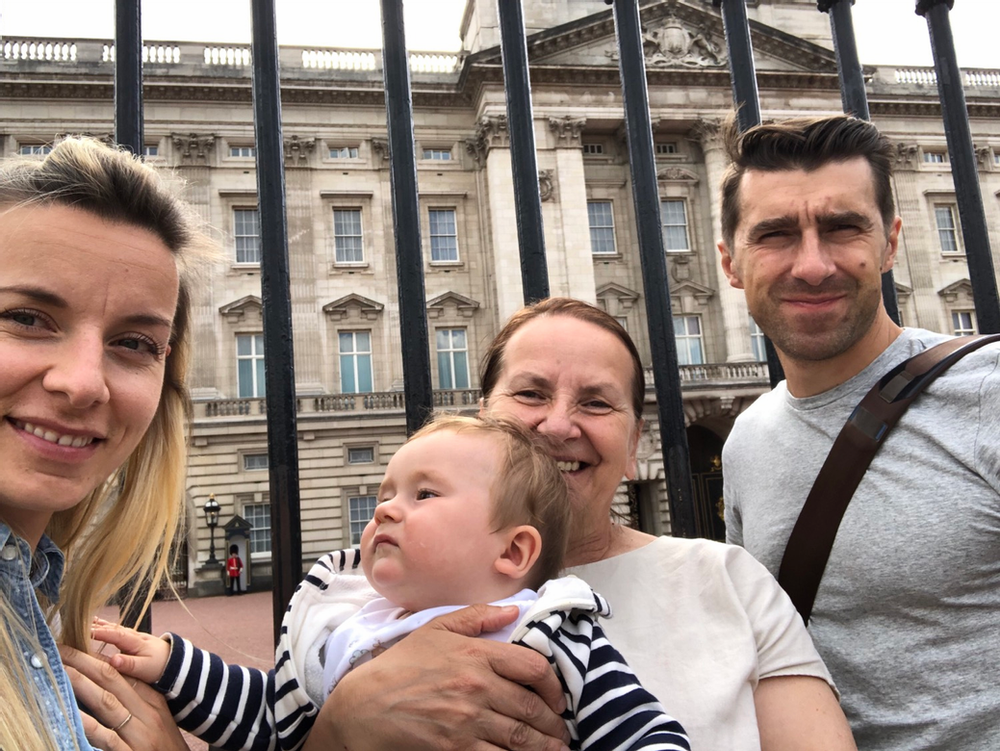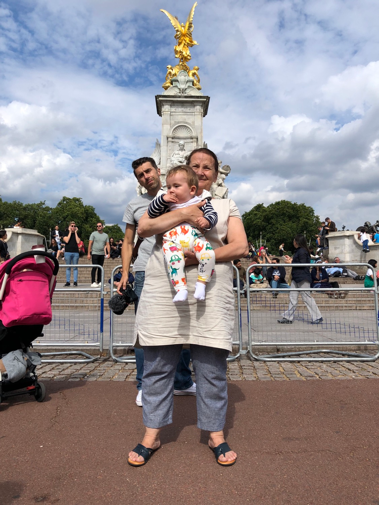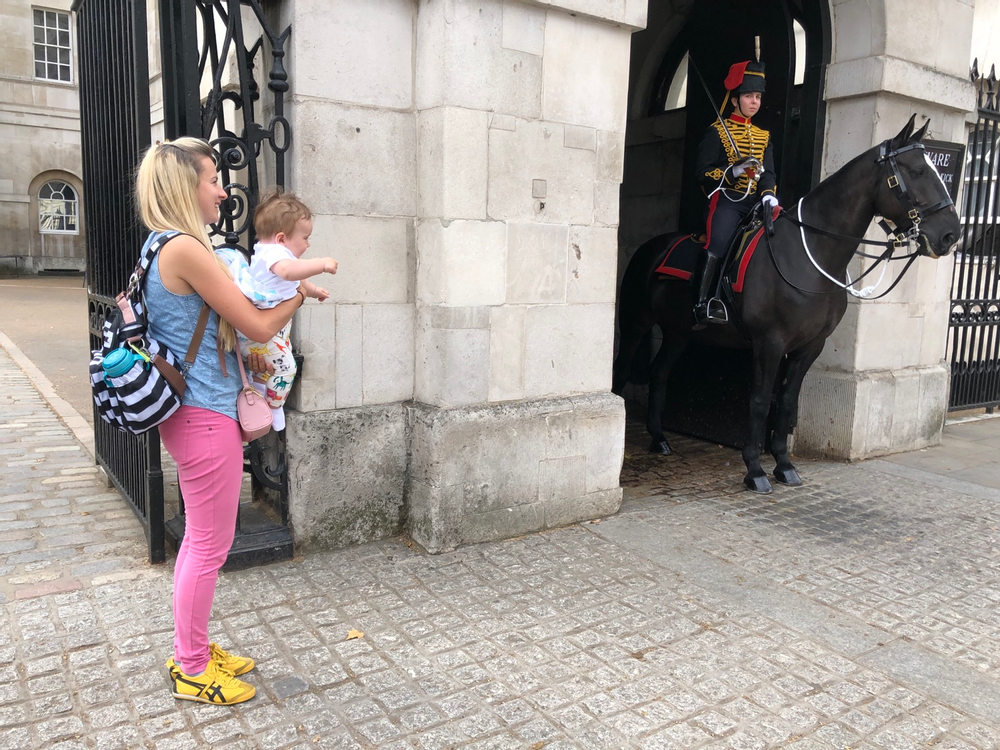 Zaglądnęliśmy do Królowej Elżbiety powiedzieć „Hi”, ale Timo bardziej był zainteresowany metalowymi pałąkami przed Pałacem Buckingham i włosami Mamy: