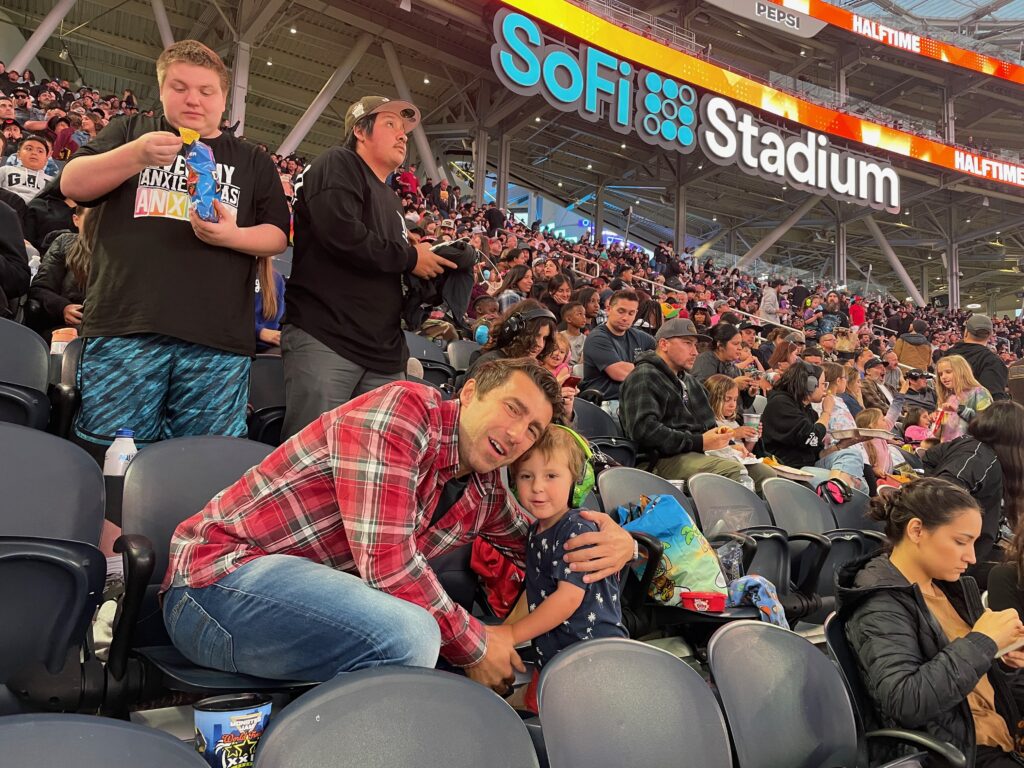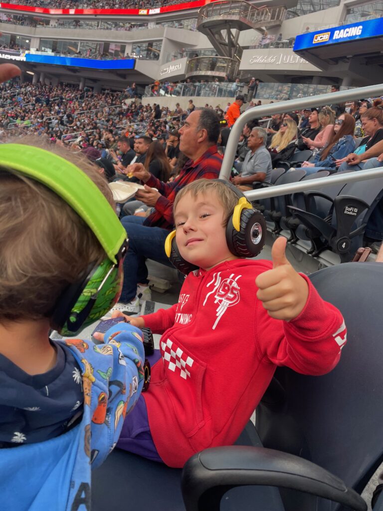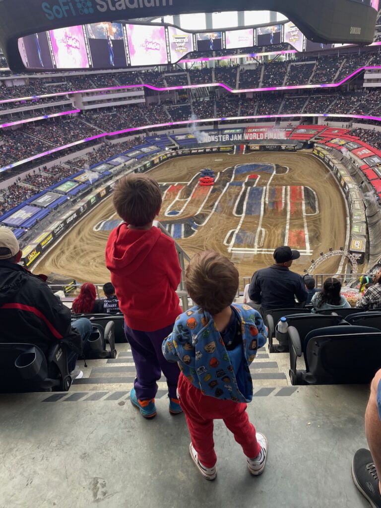 Wybraliśmy się pooglądać Monster Trucki na nowym stadionie w Inglewood. Było baaaardzo głośno, ale na szczęście mieliśmy słuchawki na uszy. Timmy najbardziej dopingował Grave Digger i Son of a Digga, a mama El Toro Loco. Bardzo podobały się nam tez przerwy, w których wjeżdżaly koparki i spycharki i naprawiały wszystkie hopki i górki.