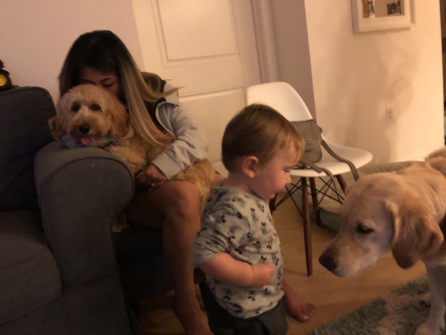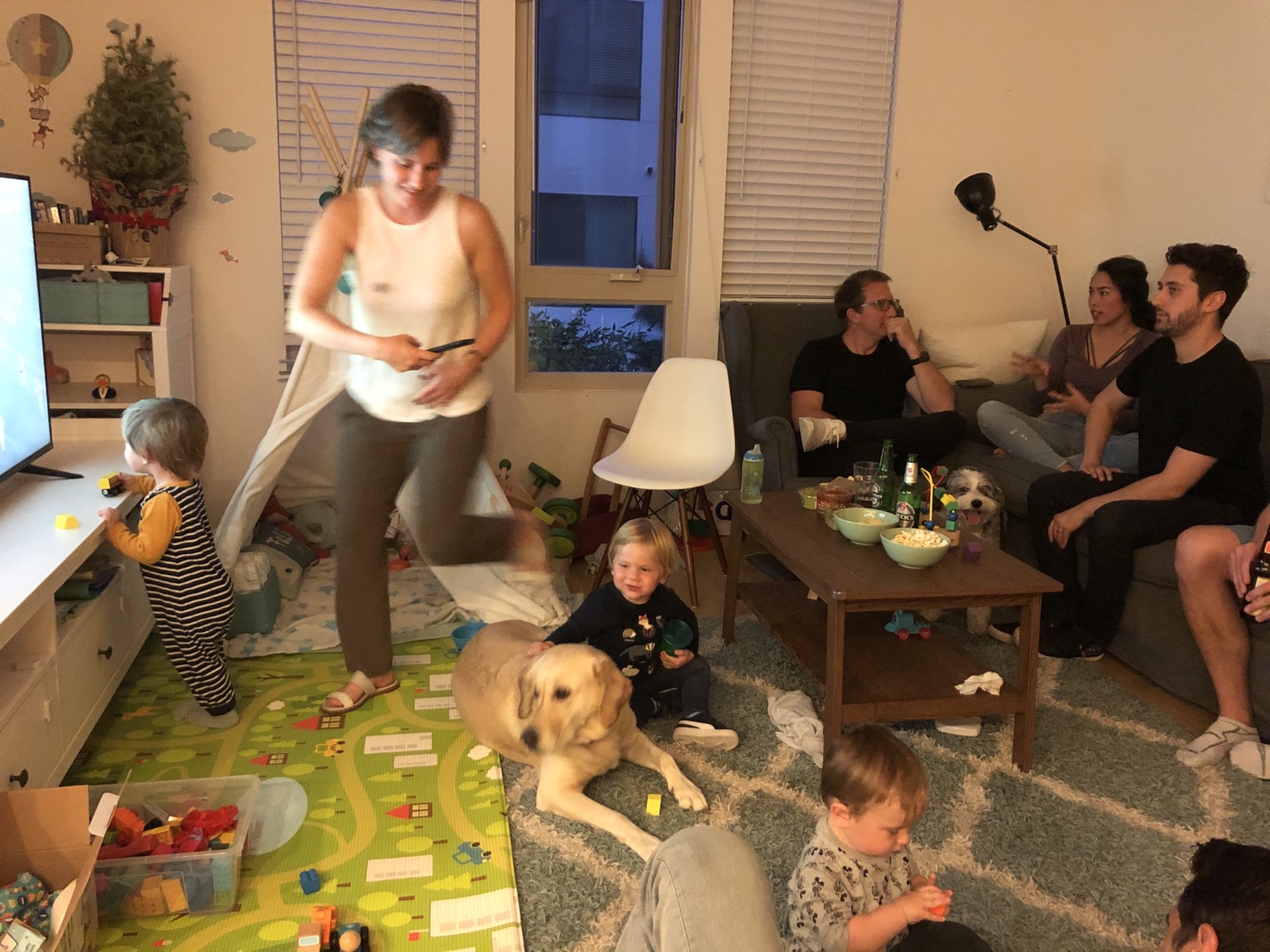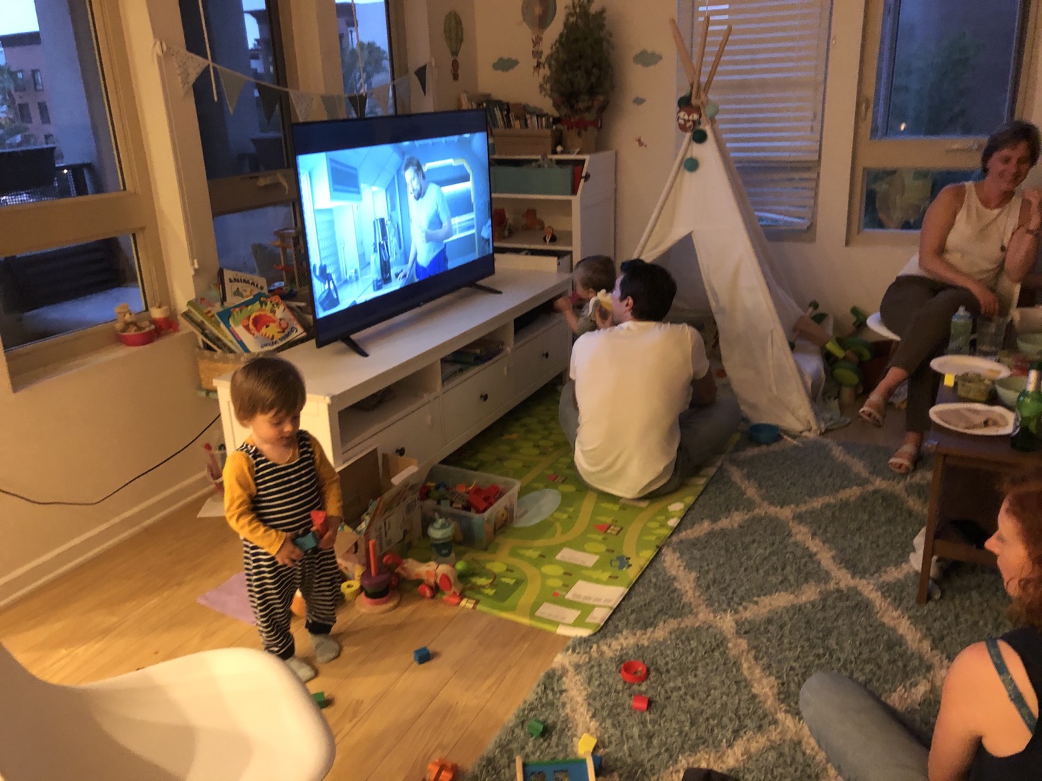 Zostaliśmy zaproszeni do Anji na oglądanie Super Bowl. Timo fajnie odnalazł się w grupie dzieci i praktycznie cały wieczór spędził na bawieniu się wszystkim, co wpadło mu w rękę. Nie stronił też od piesków… ani od telewizora ( włącznie z biciem w niego plastikowymi grabkami).